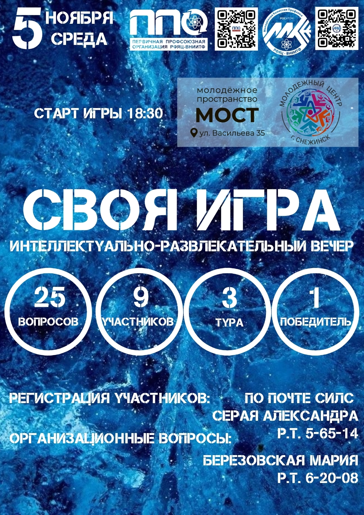Хочешь провести вечер среды увлекательно и интеллектуально? Молодёжная Комиссия ППО РФЯЦ-ВНИИТФ приглашает всех желающих разогнать осеннюю хандру и поучаствовать в увлекательной разработанной игре по мотивам популярной телепередачи!