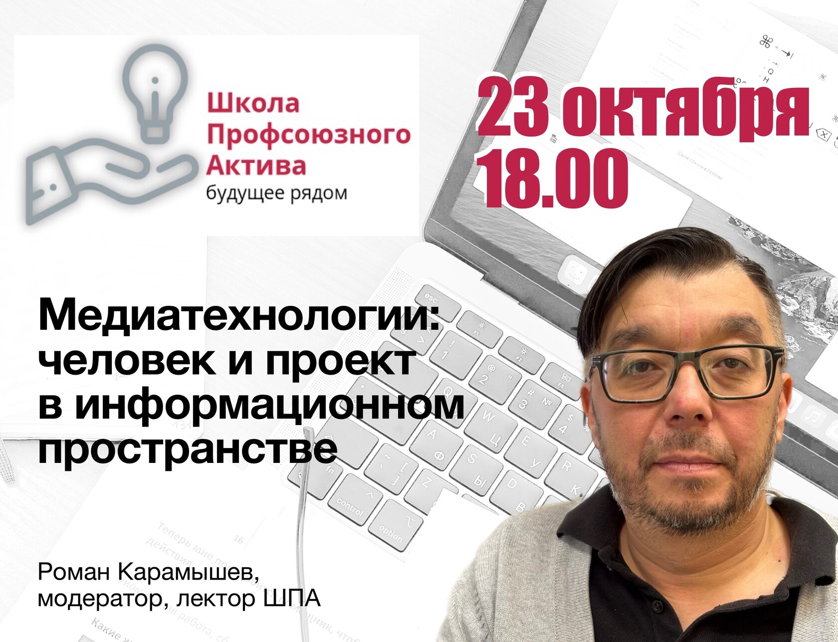 23 октября в 18.00 в ауд. 224, Центра профессионального обучения, ул. Комсомольская, 6/2, состоится лекция Романа Карамышева «Медиатехнологии: человек и проект в информационном пространстве». Приглашаем!