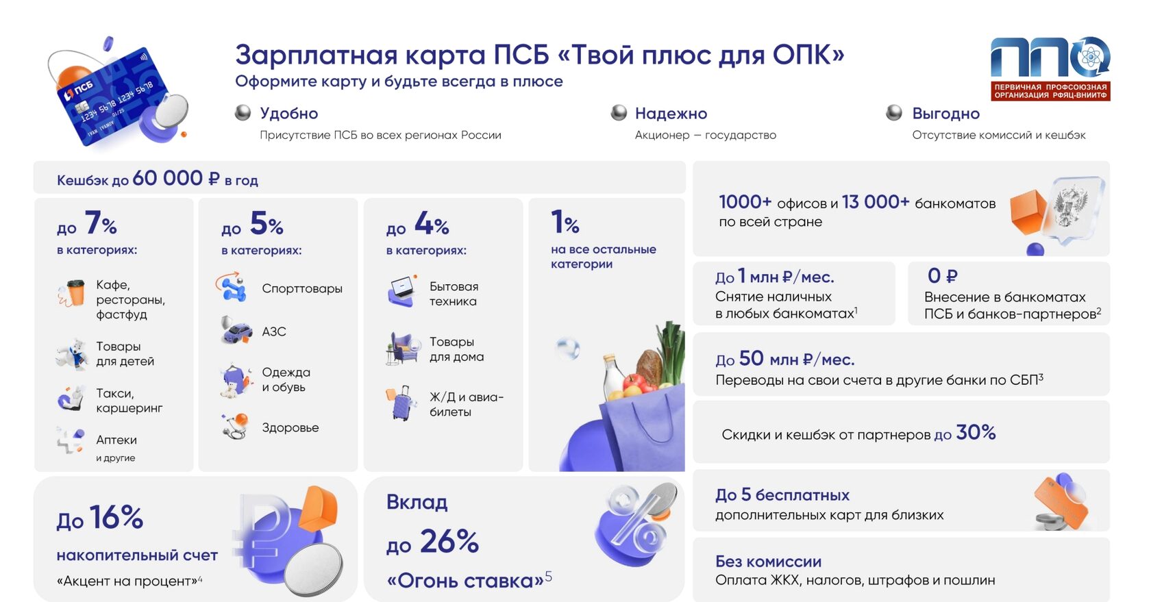Специально для членов профсоюза РФЯЦ — ВНИИТФ действуют особые условия по зарплатной карте ПСБ «Твой плюс для ОПК». Оформляйте карту и получайте привилегии, которых нет в обычных тарифах.